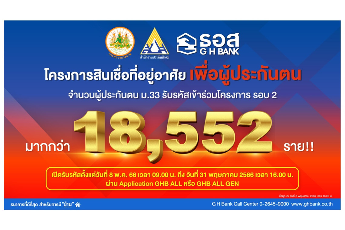 มีผู้ประกันตนในระบบประกันสังคม มาตรา 33 ขอรับรหัสเข้าร่วมโครงการผ่าน Application : GHB ALL GEN และ GHB ALL แล้วจำนวนกว่า 18,552 ราย หรือคิดเป็นวงเงินสินเชื่อ 37,104 ล้านบาท ทั้งนี้ ธอส. ยังคงเปิดให้ผู้ประกันตนที่สนใจ สามารถขอรับรหัสเข้าร่วมโครงการได้จนถึงวันที่ 31 พฤษภาคม 2566 เวลา 16.00 น. โดยปัจจุบันมีผู้ประกันตนมายื่นขอสินเชื่อโครงการดังกล่าวกับ ธอส. แล้วจำนวนมากกว่า 22,372 ล้านบาท โดยจะได้รับสิทธิในการไถ่ถอนจำนอง (รีไฟแนนซ์) ที่ดินพร้อมอาคาร ห้องชุด(คอนโดมิเนียม) จากสถาบันการเงินอื่น และให้เปลี่ยนอัตราดอกเบี้ยสำหรับผู้ประกันตนที่มีบัญชีเงินกู้ที่กู้อยู่กับ ธอส. ที่มีวงเงินกู้คงเหลือไม่เกิน 2 ล้านบาท/หลักประกัน โดยคิดอัตราดอกเบี้ยคงที่ ปีที่ 1 – ปีที่ 5 เท่ากับ 1.99% ต่อปี ปีที่ 6–8 เท่ากับ MRR-2.00% ต่อปี (เท่ากับ 4.65%) และปีที่ 9 จนถึงตลอดอายุสัญญา เท่ากับ MRR-0.50% ต่อปี (เท่ากับ 6.15%) (ปัจจุบันอัตราดอกเบี้ย MRR ของ ธอส. อยู่ที่ 6.65% ต่อปี) ผ่อนชำระนานสูงสุด 40 ปี