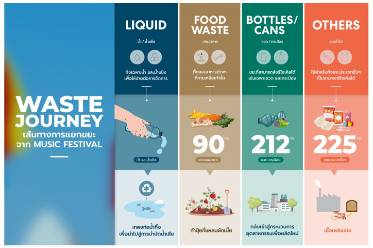 Others: สำหรับทิ้งขยะประเภทอื่นๆ ที่ไม่สามารถรีไซเคิลได้ ได้แก่ ภาชนะใส่อาหาร ช้อน ส้อม ตะเกียบ แก้วน้ำ ซองขนม ไม้เสียบลูกชิ้น หลอด ถุงพลาสติก และหนังยาง เป็นต้น เมื่อคัดแยกแล้ว มีจำนวนกว่า 225 กิโลกรัม เราได้จัดส่งให้โรงงานเพื่อแปรรูปเป็นเชื้อเพลิงทดแทน โดยกระบวนการแปรรูปนี้มีการควบคุมมลพิษอย่างถูกต้อง