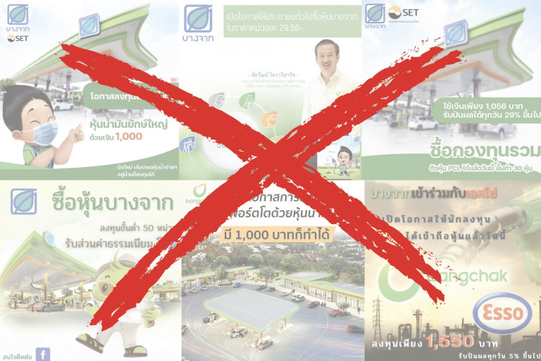 ตามที่ปรากฎในสื่อสังคมออนไลน์และการส่งต่อข้อความ เชิญชวนประชาชนลงทุนในรูปแบบต่างๆ อาทิ ชักชวนลงทุน กู้เงิน ซื้อกองทุนรวม เพื่อรับเงินปันผลสูง เข้าถือหุ้น หรือ เปิดรับสมัครเทรดหุ้น โดยแอบอ้างชื่อบริษัท ภาพกิจการ ภาพผู้บริหารและตราสัญลักษณ์ของบริษัท บางจาก คอร์ปอเรชั่น จำกัด (มหาชน) รวมถึงมีการแอบอ้างชื่อร่วมกับหน่วยงานทั้งภาครัฐ หรือบริษัทเอกชนอื่นๆ ซึ่งทำให้บริษัทฯ ได้รับความเสียหาย และทำให้สาธารณชนเกิดความสับสนและเข้าใจผิดในข้อเท็จจริง