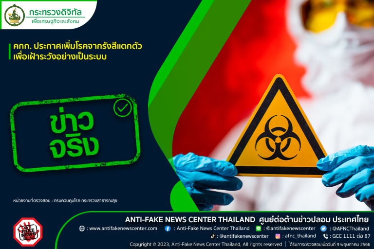 วันที่ 9 พ.ค.66 ศูนย์ต่อต้านข่าวปลอม ประเทศไทย | Anti-Fake News Center Thailand แจ้งว่า ตามที่ได้มีข่าวปรากฏในสื่อออนไลน์ถึงประเด็นเรื่องคกก. ประกาศเพิ่มโรคจากรังสีแตกตัว เพื่อเฝ้าระวังอย่างเป็นระบบ ทางศูนย์ต่อต้านข่าวปลอมได้ตรวจสอบข้อเท็จจริงกับ กรมควบคุมโรค กระทรวงสาธารณสุข พบว่าข้อมูลดังกล่าวนั้น เป็นข้อมูลจริง