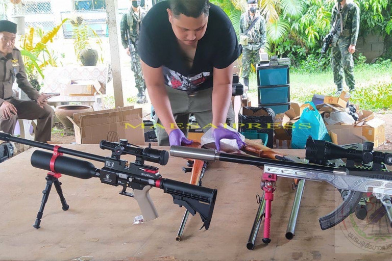 วันที่ 9 พ.ค.2566 เจ้าหน้าที่ทหารร้อย ม.4 ฉก.ทัพเจ้าตาก กองกำลังผาเมือง ร่วมกับตำรวจ สภ.เกาะช้าง อ.แม่สาย จ.เชียงราย ฝ่ายปกครอง ตชด.327 ฯลฯ นำกำลังเข้าปิดล้อมตรวจค้นพื้นที่เป้าหมายตาม พ.ร.บ.อาวุธปืนและเครื่องกระสุน พื้นที่ชายแดนไทย-เมียนมา ต.เกาะช้าง อ.แม่สาย จำนวน 2 เป้าหมาย พื้นที่หมู่บ้านศรีชัยภูมิ หมู่ 10 ต.เกาะช้าง โดยเป็นนายสุทัย 1 หลังและบ้านบิดาของนายสุทัยอีก 1 หลัง ผลการตรวจค้นพบที่โกดังภายในบ้านเก็บอาวุธปืน เครื่องกระสุนและอุปกรณ์อื่นๆ เป็นจำนวนมาก โดยประกอบด้วยปืนลูกซองยาวเบอร์ 12 จำนวน ภ กระบอก ปืนยาวขนาด .22 จำนวน 1 กระบอก ปืนยาวไทยประดิษฐ์จำนวน 1 กระบอก ปืนสั้นขนาด .38 จำนวน 1 กระบอก ปืนสั้นขนาด 9 มม.จำนวน 2 กระบอก