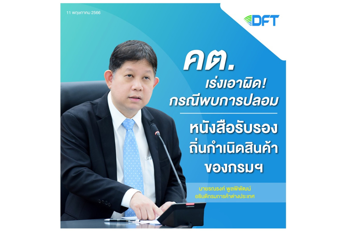 กรมการค้าต่างประเทศเร่งดำเนินการตามกฎหมายกับผู้กระทำการปลอมแปลงเอกสารหนังสือรับรองถิ่นกำเนิดสินค้า (Certificate of Origin) ของ คต. รวมทั้งประสานศุลกากรประเทศปลายทางอย่างใกล้ชิด ป้องกันไม่ให้เกิดความเสียหายต่อภาพรวมทางการค้าระหว่างประเทศของไทย