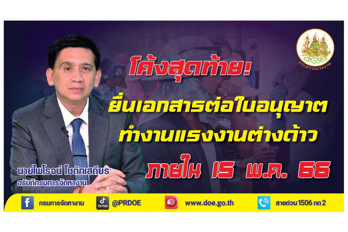 นายไพโรจน์ โชติกเสถียร อธิบดีกรมการจัดหางาน เปิดเผยว่า มติคณะรัฐมนตรีเมื่อวันที่ 7 กุมภาพันธ์ 2566 กำหนดให้คนต่างด้าวยื่นคำขอต่ออายุใบอนุญาตทำงาน ภายในวันที่ 13 กุมภาพันธ์ 2566 โดยต้องยื่นเอกสารหลักฐานให้ครบถ้วนภายในวันที่ 15 พฤษภาคม 2566 โดยที่ยังสามารถอยู่ในราชอาณาจักรเป็นกรณีพิเศษและทำงานได้อย่างถูกต้อง เพื่อให้นายจ้าง/สถานประกอบการยังคงจ้างแรงงานเหล่านั้นได้ถูกต้องตามกฎหมาย รวมทั้งภาครัฐยังสามารถกำกับและบริหารจัดการการทำงานของคนต่างด้าวได้อย่างมีประสิทธิภาพทั้งมิติของความมั่นคงและการพัฒนาเศรษฐกิจของประเทศ ซึ่งข้อมูลจากสำนักบริหารแรงงานต่างด้าว ระบุว่า มีคนต่างด้าวยื่นคำขอต่ออายุใบอนุญาตทำงานและชำระค่าธรรมเนียม จำนวน 1,873,798 คน ซึ่งมีผู้ที่ยังยื่นเอกสารหลักฐานไม่ครบถ้วนอีกจำนวนหนึ่ง กรมการจัดหางานจึงขอประชาสัมพันธ์ไปยังนายจ้างและคนต่างด้าวให้เร่งดำเนินการยื่นเอกสารหลักฐานให้ครบถ้วนภายในวันที่ 15 พฤษภาคม 2566 โดยดำเนินการ ดังนี้