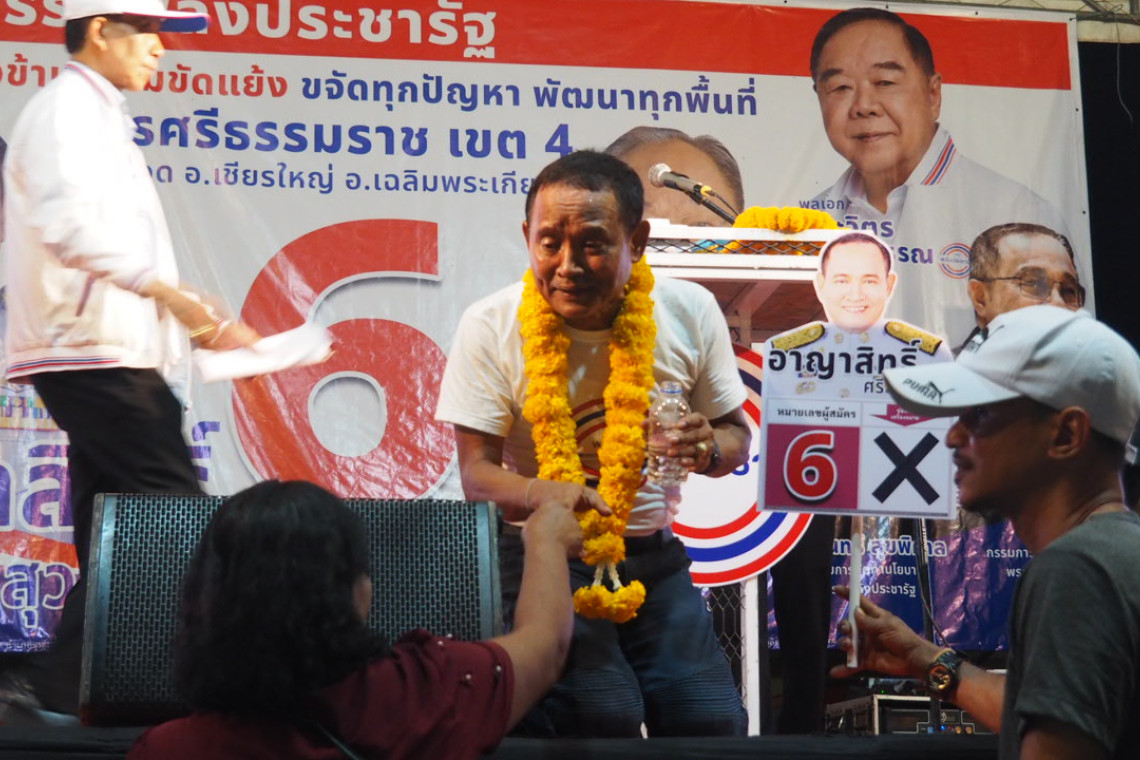 ที่หลังสถานีรถไฟชะอวด จ.นครศรีธรรมราช นายอาญาสิทธิ์ ศรีสุวรรณ เปิดปราศรัยใหญ่ รณรงค์หาเสียงเลือกตั้ง ส.ส.เขต 4 นครศรีธรรมราช โดยมีนายสนธิตน์ สนธิจีรวงศ์ ประธานยุทธศาสตร์ของพรรคและทีมงานมาช่วยปราศรัย มีชาวบ้านในพื้นที่เดินทางมาฟังการปราศรัยเกอบ 10,000 คน นายสนธิรัตน์ กล่าว่า ตั้งแต่เป็นรัฐมนตรีว่าการกระทรวงพาณิชย์ จนมาถึงรมว.พลังงาน มีแนวทางในการแก้ไขปัญหาราคาปาล์มน้ำมันตกต่ำ ในสมัยเป็นรมว.พาณิชย์ ทำได้แค่ราคา 3-4 บาท แต่พอเป็นรมว.พลังงาน นำน้ำมันปาล์มเป็นส่วนผสมบี 10 ราคาปาล์ม จึงขยับเป็นกว่า 10 บาทต่อกิโลกรัม ต่อมาตนไม่ได้ดำรงตำแหน่งนโยบายนี้ก็ไม่ได้ดำเนินการ ราคาปาล์มจึงลดลงในปัจจุบัน