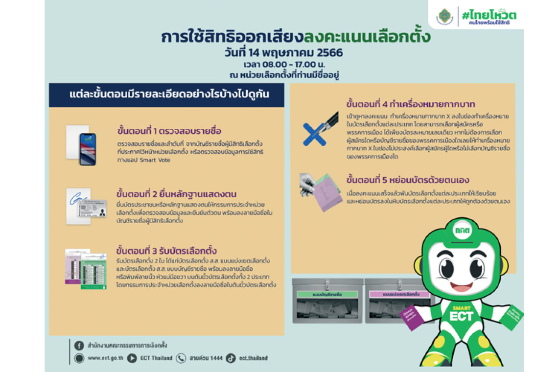 สำนักงานคณะกรรมการการเลือกตั้ง (กกต.) แจ้งเตือน การใช้สิทธิ์ออกเสียงลงคะแนนเลือกตั้ง วันที่ 14 พฤษภาคม 2566 เวลา 08.00-17.00 น.ณ หน่วยเลือกตั้งที่ท่านมีชื่ออยู่ โดยแต่ละขั้นตอนมีรายละเอียดอย่างไรบ้างไปดูกัน