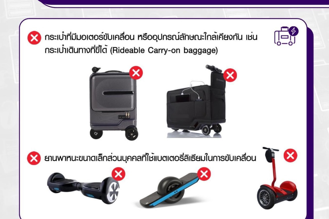 "การบินไทย" ได้ออกประกาศ ไม่รับกระเป๋าเดินทางอัจฉริยะ รวมไปถึงยานพาหนะขนาดเล็กที่ใช้แบตเตอรี่ลิเธียมขับเคลื่อน โดยว่า