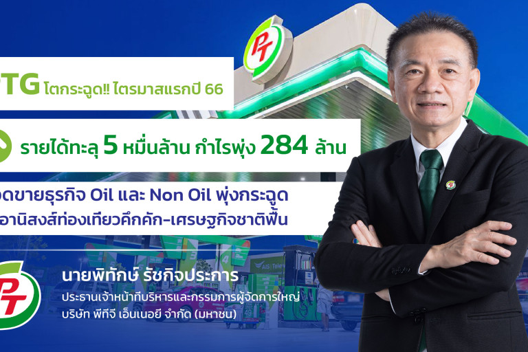 นายพิทักษ์ รัชกิจประการ ประธานเจ้าหน้าที่บริหารและกรรมการผู้จัดการ บริษัท พีทีจี เอ็นเนอยี จำกัด (มหาชน) (PTG) เปิดเผยว่า บริษัทและบริษัทย่อย มีกำไรสุทธิงวดไตรมาส 1 ปี 2566 จำนวน 284 ล้านบาท เพิ่มขึ้น 11,255.8% จากไตรมาส 4 ปี 2565 ที่มีกำไรสุทธิ 3 ล้านบาท และเพิ่มขึ้น 73.6% เมื่อเทียบงวดเดียวกันของปีก่อนที่มีกำไรสุทธิ 163 ล้านบาท โดยมีรายได้สูงสุดเป็นประวัติการณ์ที่ 50,936 ล้านบาท เติบโต 30.7% เทียบงวดเดียวกันของปีก่อน และ 4.0% จากไตรมาสก่อนหน้าหน้า โดยมีปัจจัยหลักจากธุรกิจ Oil ที่รายได้เป็น 47,790 ล้านบาท เพิ่มขึ้น 28.6% เทียบงวดเดียวกันของปีก่อน และ 3.8% จากไตรมาสก่อนหน้า
