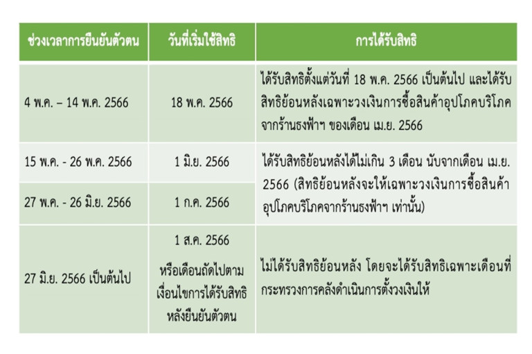 อย่างไรก็ดี สำหรับผู้ผ่านเกณฑ์คุณสมบัติรอบใหม่ที่ไม่ได้ยืนยันตัวตนภายในวันอาทิตย์ที่ 14 พฤษภาคม 2566 ยังคงสามารถยืนยันตัวตนได้ที่ธนาคารทั้งสามแห่งข้างต้นตามวันเวลาที่หน่วยงานกำหนด แต่จะสามารถเริ่มใช้สิทธิสวัสดิการแห่งรัฐได้ตามวันที่กระทรวงการคลังกำหนด โดยรายละเอียดช่วงเวลาการยืนยันตัวตนและวันที่เริ่มใช้สิทธิ
