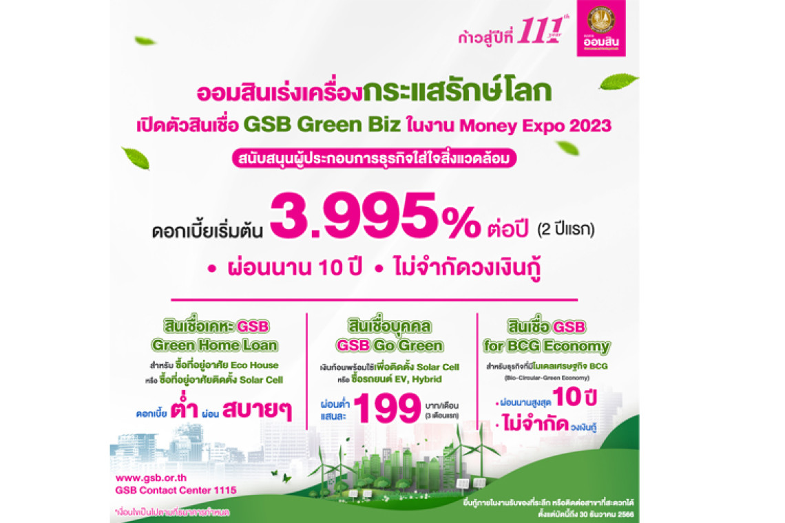 ธนาคารออมสิน ได้จัดโปรโมชันสินเชื่อเพื่อรักษ์โลกและสิ่งแวดล้อม ในงานมหกรรมการเงิน Money Expo 2023 Bangkok จัดขึ้นระหว่างวันที่ 11 – 14 พฤษภาคม 2566 ณ อาคารชาเลนเจอร์ 2 – 3 อิมแพ็ค เมืองทองธานี โดยจัดทำแคมเปญสินเชื่อ “GSB Green Biz” เพื่อสนับสนุนการขับเคลื่อนกลุ่มธุรกิจที่ใส่ใจสิ่งแวดล้อม ตอบโจทย์ผู้บริโภคตามกระแสอนุรักษ์พลังงานและลดการปล่อยก๊าซเรือนกระจก สำหรับกลุ่มผู้ประกอบการธุรกิจสีเขียวที่ให้ความสำคัญในการแก้ปัญหามลพิษ อาทิ ธุรกิจผลิตและจำหน่ายรถยนต์ไฟฟ้า ธุรกิจผลิตวัสดุรีไซเคิล ธุรกิจตามแนวคิด Eco-Friendly ด้วยเงื่อนไขพิเศษ อัตราดอกเบี้ย 3.995% ต่อปี (คงที่ 2 ปีแรก) ผ่อนนาน 10 ปี และไม่จำกัดวงเงินกู้ เพื่อเป็นทุนหมุนเวียนในการดำเนินกิจการ ลงทุนในทรัพย์สินถาวร เพื่อลงทุนด้านพลังงานทดแทน หรือรีไฟแนนซ์