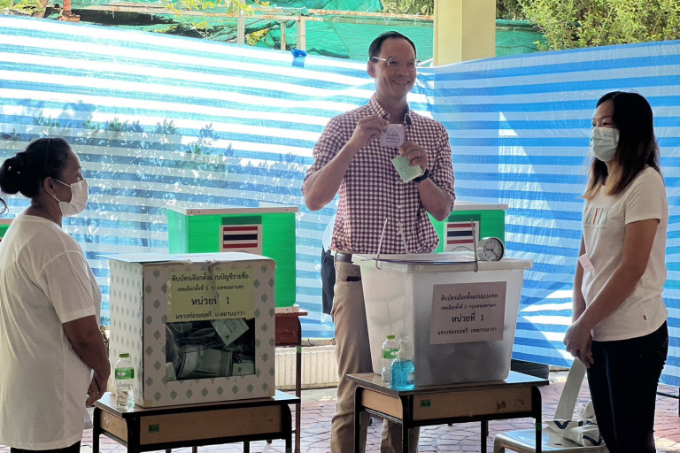 วันที่ 14 พ.ค.2566 เวลา 09.30 น.นายกรณ์ จาติกวณิช แคนดิเดตนายกรัฐมนตรี พรรคชาติพัฒนากล้า เดินทางพร้อมครอบครัว นางวรกร จาติกวณิช ภรรยา นายพงศกร มหาเปารยะ หรือแต๊ง อดีตนักแสดง นายพันธิตร มหาเปารยะ น.ส.กานต์ จาติกวณิช มาลงคะแนนเสียงเลือกตั้ง ที่หน่วยเลือกตั้งที่ 1 สถานที่เลี้ยงเด็กนอดดี้เพลย์กรุ๊ป ในเขต เลือกตั้งที่ 3 แขวงช่องนนทรี เขตยานนาวา กรุงเทพฯ