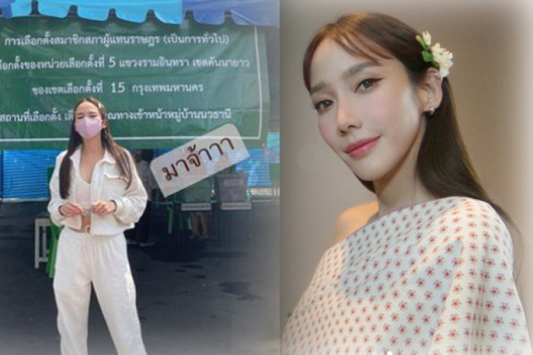 ด้านซุปตาร์ "อั้ม" พัชราภา ไชยเชื้อ โพสต์ภาพเข้าคูหา หน่วยเลือกตั้งที่ 5 แขวงรามอินทรา เขตคันนายาว ผ่านอินสตาแกรมสตอรี่ @aum_patchrapa พร้อมระบุข้อความว่า