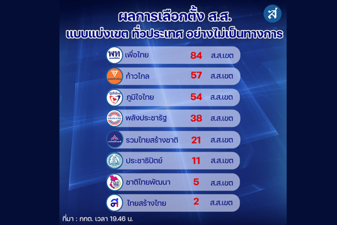 14 พฤษภาคม 2566 20:17 น. สยามรัฐออนไลน์ การเมือง เว็บไซต์ กกต. รายงานความคืบหน้าผลการนับคะแนนเลือกตั้ง “แบบแบ่งเขต” อย่างไม่เป็นทางการ ณ เวลา 19.46 น.