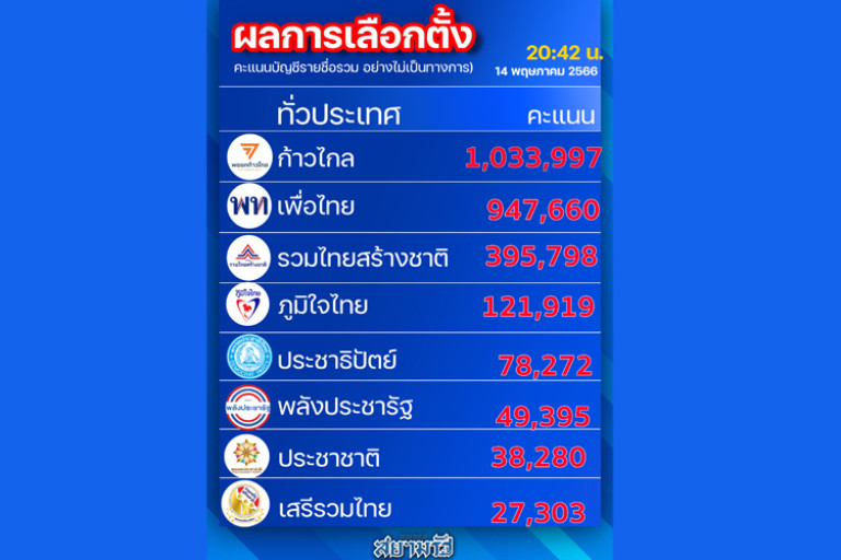 14 พฤษภาคม 2566 21:21 น. สยามรัฐออนไลน์ การเมือง เว็บไซต์ กกต. รายงานความคืบหน้าผลการนับคะแนนเลือกตั้ง “ส.ส.แบบบัญชีรายชื่อ” อย่างไม่เป็นทางการ ณ เวลา 20.42 น.