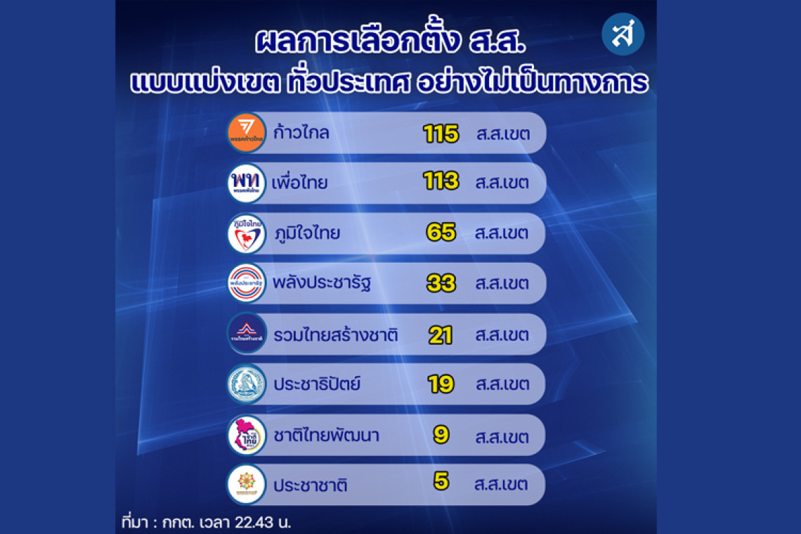 14 พฤษภาคม 2566 23:05 น. สยามรัฐออนไลน์ การเมือง เว็บไซต์ กกต. รายงานความคืบหน้าผลการนับคะแนนเลือกตั้ง “ส.ส.แบบแบ่งเขต” อย่างไม่เป็นทางการ ณ เวลา 22.43 น.