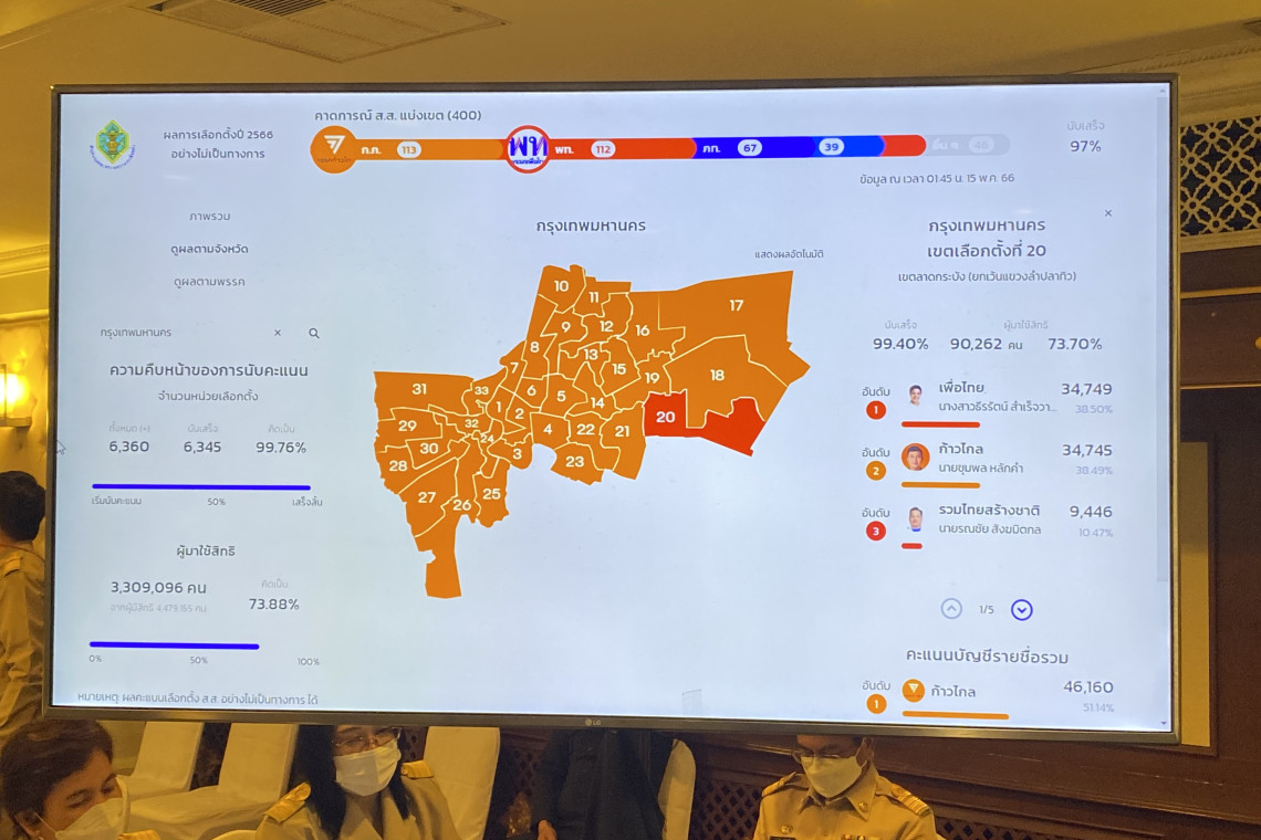 เมื่อเวลา 02.00 วันที่15 พ.ค. ที่ศูนย์ประสานงานการเลือกตั้งสมาชิกสภาผู้แทนราษฎรกรุงเทพมหานคร ศาลาว่าการกรุงเทพมหานคร เสาชิงช้า นายสำราญ ตันพานิช ผู้อำนวยการสถาบันพัฒนาการเมืองและการเลือกตั้ง ในฐานะที่กำกับดูแลการเลือกตั้งกรุงเทพมหานคร นายขจิต ชัชวานิชย์ ปลัดกรุงเทพมหานคร (กทม.) รายงานผลการเลือกตั้งสมาชิกสภาผู้แทนราษฎร (ส.ส.) พื้นที่กรุงเทพฯ แบบแบ่งเขตทั้ง 33 เขต อย่างไม่เป็นทางการ