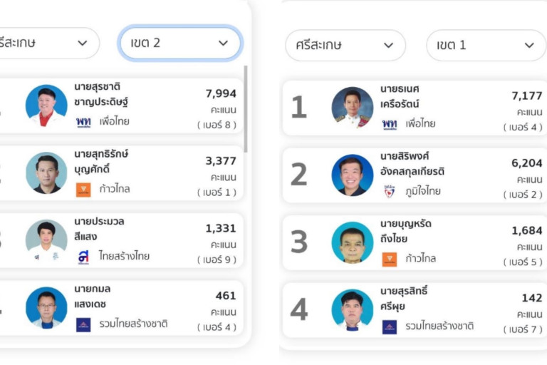 วันที่ 15 พค 2566 เวลา 05.00 น ผู้สื่อข่าวรายงานว่า สรุปผลการเลือกตั้ง (อย่างไม่เป็นทางการ) สมาชิกสภาผู้แทนราษฎร จ.ศรีสะเกษ