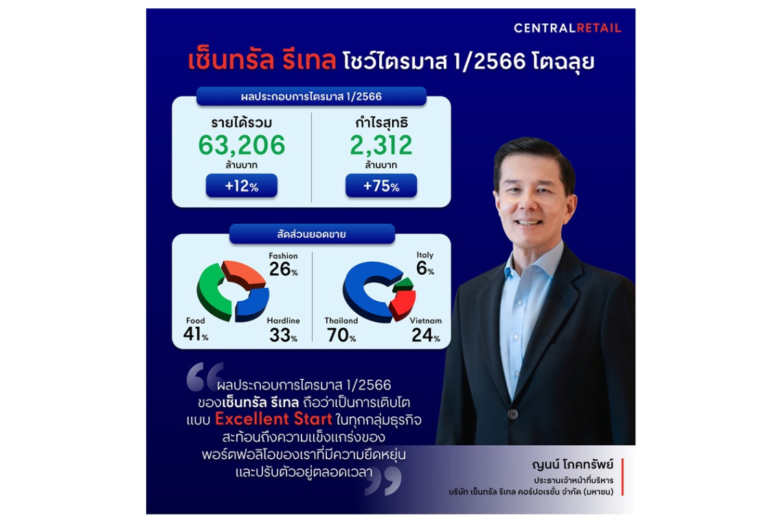 เซ็นทรัล รีเทล เปิดปีโตฉลุย กวาดรายได้ Q1 63,206 ล้านบาท (+12%) กำไรพุ่ง 2,312 ล้านบาท (+75%)