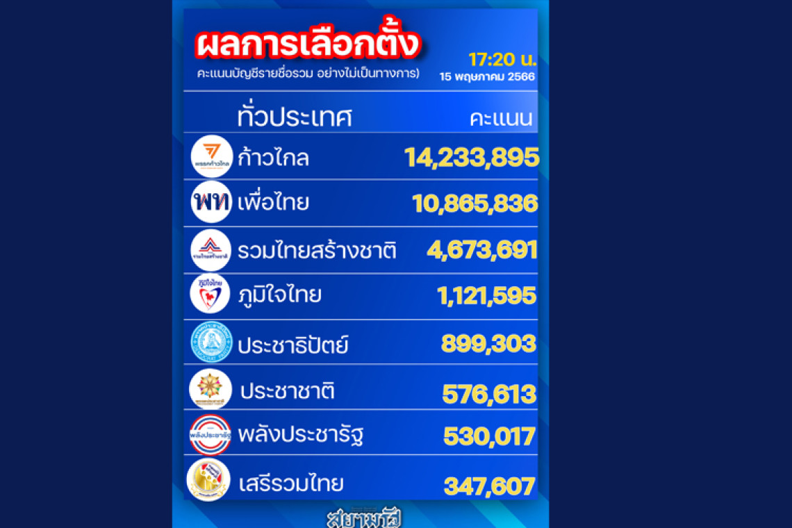 ผลนับคะแนนเลือกตั้ง 2566 อย่างไม่เป็นทางการ “ก้าวไกล” คว้าใจคนไทยทั่วประเทศทะลุ 14 ล้านเสียง