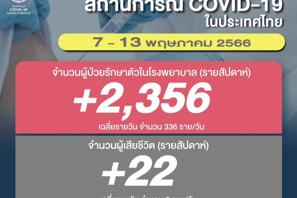 วันที่ 15 พ.ค.2566 ศูนย์ข้อมูล COVID-19 กรมประชาสัมพันธ์ รายงานสถานการณ์โรคโควิด-19 รายสัปดาห์ เกาะติดยอดผู้ติดเชื้อโควิด-19 รายสัปดาห์ ระหว่างวันที่ 7 - 13 พฤษภาคม 2566 พบผู้ป่วยรักษาตัวในโรงพยาบาล (รายสัปดาห์) จำนวน 2,356 ราย : เฉลี่ยรายวัน จำนวน 336 ราย/วัน ผู้เสียชีวิต (รายสัปดาห์) จำนวน 22 ราย : เฉลี่ยรายวัน จำนวน 1 ราย/วัน ทั้งนี้พบยอดป่วยสะสม 12,437 ราย (ตั้งแต่ 1 มกราคม 2566)เสียชีวิตสะสม 320 ราย (ตั้งแต่ 1 มกราคม 2566)