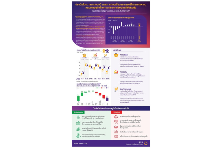 SCB EIC ประเมินเศรษฐกิจไทยในระยะต่อไปมีแนวโน้มขยายตัวต่อเนื่องจากนักท่องเที่ยวต่างชาติที่มีแนวโน้มฟื้นตัวดีตามการกลับมาของนักท่องเที่ยวจีนและอาเซียน อีกทั้งการท่องเที่ยวในประเทศเติบโตตามความต้องการท่องเที่ยวที่ยังอยู่ในระดับสูง ส่งผลให้ภาคบริการในภาพรวมโดยเฉพาะบริการที่เกี่ยวเนื่องกับการท่องเที่ยว เช่น โรงแรม ร้านอาหาร และการขนส่ง ปรับตัวดีขึ้น อีกทั้ง การบริโภคภาคเอกชนยังมีแนวโน้มขยายตัวดี โดยเฉพาะไตรมาส 2 ที่มีเม็ดเงินหาเสียงช่วงเลือกตั้งช่วยกระตุ้นเศรษฐกิจ ในภาพรวมเศรษฐกิจไทยเข้าใกล้ระดับก่อนเกิดวิกฤติโควิดและคาดจะกลับสู่ระดับก่อนการระบาดได้ในช่วงกลางปีนี้ อย่างไรก็ดี แม้การส่งออกยังน่าห่วงและมีแนวโน้มหดตัวในครึ่งแรกของปีตามทิศทางเศรษฐกิจและการค้าโลกที่ยังไม่สดใสและปัจจัยฐานสูง จนอาจกดดันการลงทุนและการผลิตเพื่อส่งออกได้ แต่การส่งออกมีแนวโน้มทยอยปรับดีขึ้นในช่วงครึ่งหลังของปีจากอานิสงส์การฟื้นตัวของอุปสงค์ในจีนหลังเปิดประเทศ รวมถึงเศรษฐกิจโลกที่จะผ่านจุดต่ำสุดแล้ว