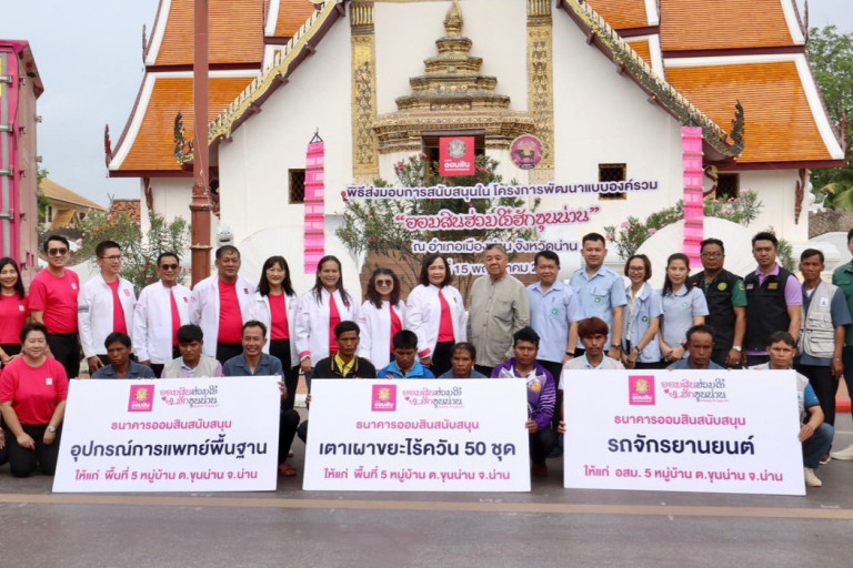 นางบุญรักษ์ อุดมอิทธิพงศ์ และนางปรางมาศ เธียรธนู รองผู้อำนวยการธนาคารออมสิน นำทีมผู้บริหาร พนักงานและลูกจ้าง ลงพื้นที่จัดกิจกรรมการยกระดับคุณภาพชีวิตแก่ประชาชนในพื้นที่ห่างไกลของ จ.น่าน ซึ่งเป็นความต่อเนื่องภายใต้การดำเนินโครงการพัฒนาแบบองค์รวม จ.น่าน โดยให้การสนับสนุนด้านการแพทย์ในรูปแบบรถจักรยานยนต์พยาบาล ประกอบด้วย กระเป๋า อสม. อุปกรณ์การแพทย์พื้นฐาน และชุดยาสามัญประจำบ้าน สำหรับอาสาสมัครสาธารณสุขประจำหมู่บ้านในพื้นที่เป้าหมายการพัฒนา ได้แก่ บ้านห้วยเต๋ย บ้านสะเกี้ยง บ้านห้วยฟอง บ้านเปียงซ้อ และบ้านสะจุก พร้อมทั้งสนับสนุนการปรับปรุงห้องเก็บอุปกรณ์ เปลี่ยนหลังคาสำนักงาน และอุปกรณ์การแพทย์ แก่โรงพยาบาลส่งเสริมสุขภาพตำบลบ้านสะจุก โอกาสนี้ได้มอบเตาเผาขยะเพื่อร่วมดูแลสิ่งแวดล้อมให้แก่ชุมชนในพื้นที่ ทั้ง 5 หมู่บ้านบนยอดดอยใน ต.ขุนน่าน อ.เฉลิมพระเกียรติ โดยมีนายชาญชัย ฝอยทอง ผู้ช่วยผู้อำนวยการธนาคารออมสิน สายงานกิจการสาขา 3 เรือตรีสุชาญ ภู่สุวรรณ์ ผู้อำนวยการธนาคารออมสินภาค 9 พร้อมด้วยผู้บริหาร พนักงานและลูกจ้างธนาคารออมสิน ผู้แทนชุมชนน่านในพื้นที่ร่วมกิจกรรม ณ วัดภูมินทร์ จ.น่าน