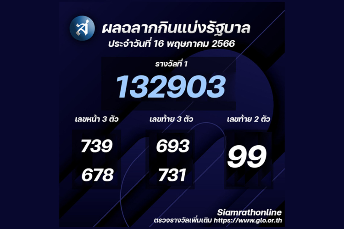 ผลสลากกินแบ่งรัฐบาลงวดประจำวันที่ 16 พ.ค.2566 รางวัลที่ 1 : 132903