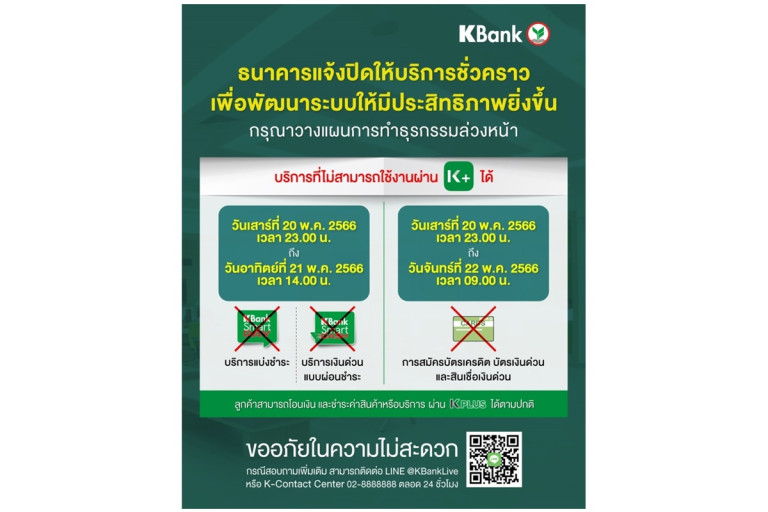 ทั้งนี้ ลูกค้าสามารถโอนเงิน และชำระค่าสินค้าหรือบริการ ผ่าน K PLUS ได้ตามปกติ กรุณาวางแผนการทำธุรกรรมล่วงหน้า สอบถามข้อมูลเพิ่มเติมได้ที่ LINE @KBankLive หรือ K-Contact Center โทร.02-888-8888 ตลอด 24 ชั่วโมง