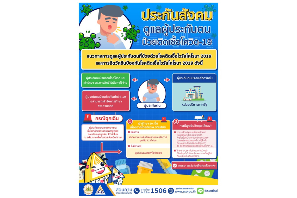 ประกันสังคมพร้อมดูแลผู้ประกันตนป่วยติดเชื้อโควิด-19 รักษา ณ สถานพยาบาลตามสิทธิของผู้ประกันตน โดยไม่เสียค่าใช้จ่าย ผู้ประกันตนสามารถเข้ารับการฉีดวัคซีนป้องกันโรคติดเชื้อโควิด-19 ณ หน่วยบริการภาครัฐ โดยไม่เสียค่าใช้จ่าย เจ็บป่วยฉุกเฉินวิกฤติ มีสิทธิทุกที่เข้ารักษาสถานพยาบาลที่อยู่ใกล้ที่สุดได้โดยไม่เสียค่าใช้จ่าย