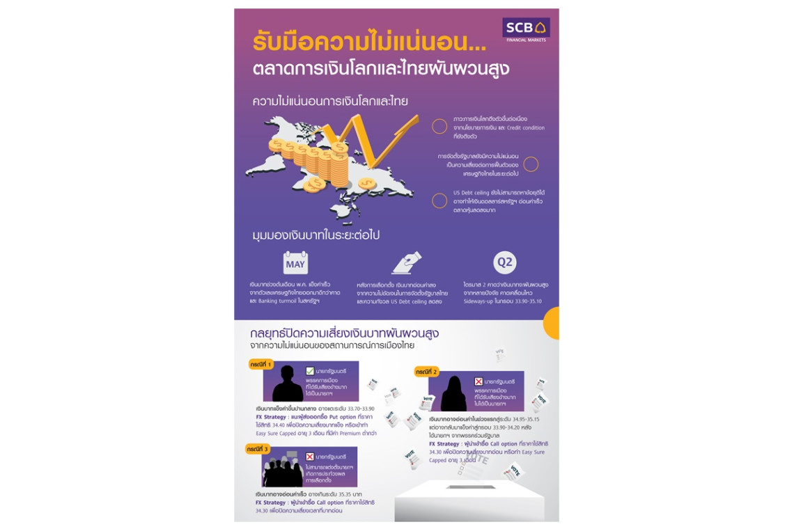 ตลาดการเงินไทยและโลกเผชิญความไม่แน่นอนสูง ทำให้เงินบาทมีแนวโน้มผันผวน ทั้งจาก 1) ประเด็นเรื่อง US Debt ceiling ที่ยังไม่สามารถหาขอยุติได้ โดยกระทรวงการคลังสหรัฐฯ ประเมินว่าสหรัฐฯ อาจผิดชำระหนี้อย่างเร็วในวันที่ 1 มิ.ย. (X-date) ซึ่งหากภาครัฐไม่สามารถขยายเพดานหนี้ได้ทัน ก็จะส่งผลให้เศรษฐกิจชะลอลงรุนแรงจนอาจเข้าสู่ภาวะถดถอยได้ เงินดอลลาร์สหรัฐฯ อาจอ่อนค่าเร็ว เงินทุนไหลออก ตลาดหุ้นลดลงมาก 2) ภาวะการเงินโลกตึงตัวยังต่อเนื่อง จากนโยบายการเงินและการปล่อยสินเชื่อที่ยังเข้มงวด โดย Fed มีแนวโน้มคงดอกเบี้ยในช่วงที่เหลือของปี ขณะที่ ECB ยังมีแนวโน้มขึ้นดอกเบี้ยต่ออีก 2 ครั้งในปีนี้ นอกจากนี้ ความเสี่ยงในภาคสถาบันการเงินในสหรัฐฯ และยุโรป ทำให้สถาบันการเงินเพิ่มความเข้มงวดในการปล่อยสินเชื่อ และ 3) การจัดตั้งรัฐบาลยังมีความไม่แน่นอนอยู่มาก เป็นความเสี่ยงต่อการฟื้นตัวของเศรษฐกิจไทย โดยเศรษฐกิจไทยไตรมาสแรกแม้จะฟื้นตัวดีจากการอุปโภคบริโภคภาคเอกชน สอดคล้องกับภาคการท่องเที่ยวและบริการที่ฟื้นตัวดี อย่างไรก็ดี ระยะเวลาในการการจัดตั้งรัฐบาล จะส่งผลต่อการเบิกจ่ายภาครัฐในไตรมาส 4 เป็นต้นไป