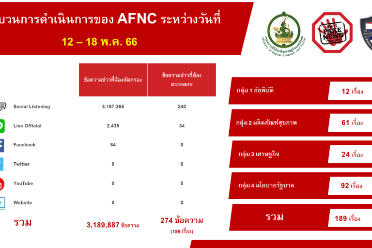ดร.เวทางค์ พ่วงทรัพย์ รองปลัดกระทรวงดิจิทัลเพื่อเศรษฐกิจและสังคม (ดีอีเอส) และโฆษกกระทรวงฯ ฝ่ายข้าราชการประจำ กล่าวถึง ผลการมอร์นิเตอร์และรับแจ้งข่าวปลอมของศูนย์ต่อต้านข่าวปลอม ระหว่างวันที่ 12 - 18 พฤษภาคม 2566 พบข้อความที่เข้ามาทั้งหมด 3,189,887ข้อความ โดยมีข้อความที่ต้องดำเนินการตรวจสอบ (Verify) ทั้งสิ้น 274 ข้อความ ทั้งนี้ช่องทางที่มีการพบเบาะแสมากที่สุด คือ ข้อความที่มาจาก Social listening จำนวน 240 ข้อความ ตามมาด้วยการแจ้งเบาะแสผ่าน Line Official จำนวน 34 ข้อความ รวมเรื่องที่ต้องดำเนินการตรวจสอบทั้งหมด 189 เรื่อง และจากการประสานงานกับหน่วยงานที่เกี่ยวข้อง ได้รับผลการตรวจสอบกลับมาแล้ว 85 เรื่อง