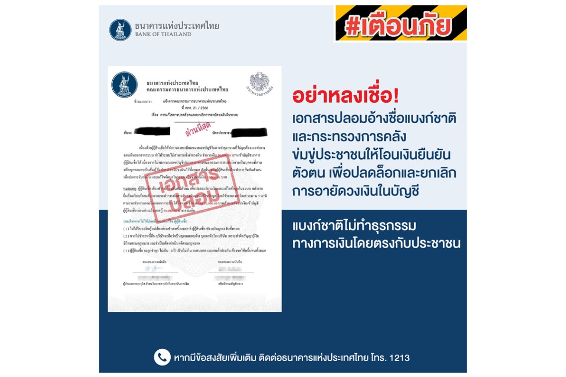 กระทรวงการคลังเตือนอย่าหลงเชื่อเอกสารปลอมอ้างชื่อแบงก์ชาติและกระทรวงการคลัง ข่มขู่ประชาชนให้โอนเงินยืนยันตัวตน เพื่อปลดล็อกและยกเลิกการอายัดวงเงินในบัญชี ขอย้ำอีกครั้งว่า แบงก์ชาติไม่ทำธุรกรรมทางการเงินโดยตรงกับประชาชน