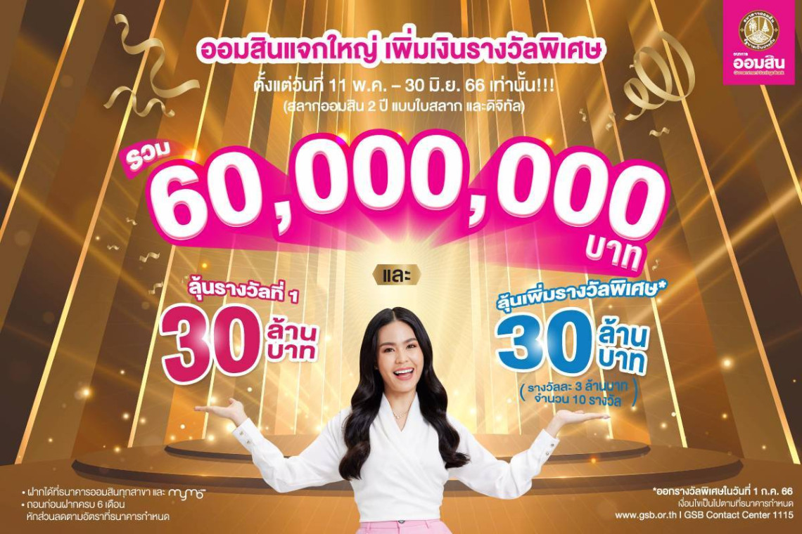 ออมสินจัดใหญ่ เอาใจลูกค้าสลากออมสิน เพิ่มทั้งเงินรางวัลที่ 1 และรางวัลพิเศษมูลค่ารวม 60 ล้านบาท เปิดรับฝากตั้งแต่วันนี้เป็นต้นไปจนถึงวันที่ 30 มิ.ย.66