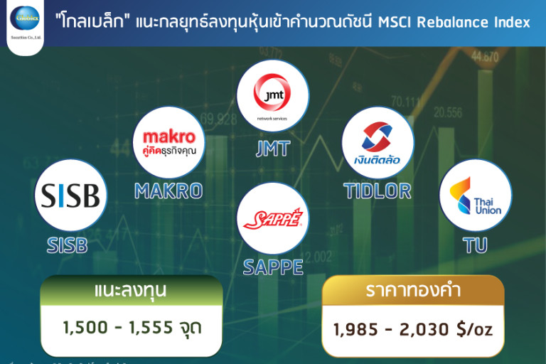 ส่วนปัจจัยต่างประเทศที่ต้องจับตาวันนี้ 23 พ.ค. อียูรายงานดัชนีผู้จัดการฝ่ายจัดซื้อ (PMI) ภาคบริการ-ภาคการผลิตขั้นต้นเดือนพ.ค. สหรัฐ รายงานดัชนีผู้จัดการฝ่ายจัดซื้อ (PMI) ภาคบริการ-ภาคการผลิตขั้นต้นเดือนพ.ค. และยอดขายบ้านใหม่เดือนเม.ย. วันที่ 24 พ.ค. สหรัฐ รายงานสต็อกน้ำมันรายสัปดาห์ (เช้าวันที่ 25 พ.ค.) คณะกรรมการกำหนดนโยบายการเงินของธนาคารกลางสหรัฐ (FOMC) เปิดเผยรายงานการประชุม วันที่ 2-3 พ.ค. วันที่ 25 พ.ค. สหรัฐรายงานจำนวนผู้ขอรับสวัสดิการว่างงานรายสัปดาห์ GDP 1Q66 (ประมาณการครั้งที่ 2) ยอดทำสัญญาขายบ้านที่รอปิดการขาย (Pending Home Sales) เดือนเม.ย. 1 มิ.ย. วันสุดท้ายของ ของการบรรลุข้อตกลงการเพิ่มเพดานหนี้สหรัฐ และวันที่ 4 มิ.ย. โอเปกและชาติพันธมิตรประชุมเพื่อกำหนดนโยบายการผลิตน้ำมัน ดังนั้น แนะนำกลยุทธ์การลงทุนในหุ้นที่ได้เข้าคำนวณดัชนี MSCI Rebalance Index ซึ่งมีผลวันที่ 31 พ.ค. 66 โดย MSCI Global Standard หุ้นเข้า MAKRO หุ้นที่ถูกนำออกจากการคำนวณ JMT, TU และ MSCI Small Cap หุ้นเข้า JMT, TIDLOR, SAPPE, SISB และ TU