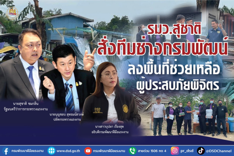 นางสาวบุปผา เรืองสุด อธิบดีกรมพัฒนาฝีมือแรงงาน กล่าวว่า กรมพัฒนาฝีมือแรงงานมอบหมายให้สำนักงานพัฒนาฝีมือแรงงานพิจิตร (สนพ.พิจิตร) จัดหน่วยบริการเคลื่อนที่ให้ความช่วยเหลือนำน้ำดื่มไปมอบให้แก่ผู้ประสบภัย จากการสำรวจความเสียหายร่วมกับจังหวัดพิจิตร สำนักงานป้องกันและบรรเทาสาธารณภัยจังหวัด ประธานสภาเทศบาลตำบลเนินปอ และผู้ใหญ่บ้านหมู่ที่ 6 เบื้องต้นได้ประสานกับผู้นำชุมชนหาก สนพ.พิจิตร ได้รับวัสดุอุปกรณ์สำหรับใช้ในการซ่อมแซมแล้วจะจัดส่งเจ้าหน้าที่เข้าช่วยเหลือซ่อมแซมบ้านเรือนประชาชนในทันที