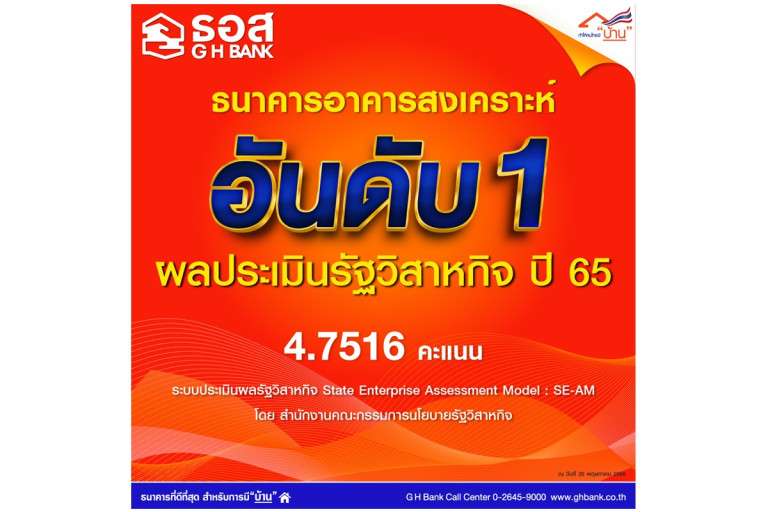 ทั้งนี้ การที่ธนาคารได้รับคะแนนผลประเมินผลการดำเนินงานรัฐวิสาหกิจ ประจำปี 2565 สูงที่สุดเป็นอันดับ 1 ด้วยคะแนนรวม 4.7516 สูงสุดในการประเมินผลการดำเนินงานรัฐวิสาหกิจทั้ง 51 แห่ง เป็นผลมาจากการร่วมมือกันของผู้บริหาร พนักงานทุกคนภายในองค์กรที่มุ่งมั่น ตั้งใจขับเคลื่อนองค์กรให้สัมฤทธิ์ผลตามพันธกิจ “ทำให้คนไทยมีบ้าน” และยังคงพร้อมดำเนินงานเพื่อให้องค์กรบรรลุวิสัยทัศน์ “ธนาคารที่ดีที่สุดสำหรับการมีบ้าน” ต่อไป