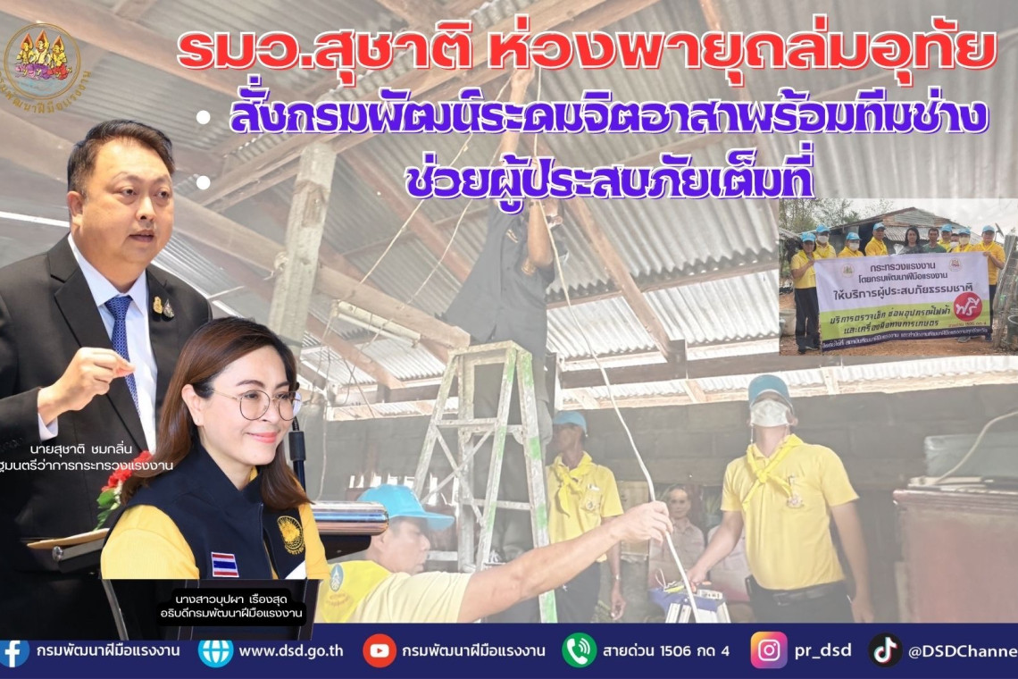 กระทรวงแรงงาน โดยกรมพัฒนาฝีมือแรงงาน ระดมจิตอาสาพร้อมจัดทีมช่างช่วยเหลือซ่อมแซมแจกสิ่งของจำเป็นให้แก่ผู้ประสบวาตภัยอุทัยธานี