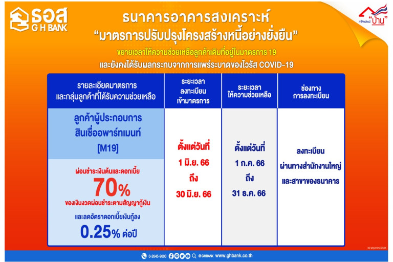 ธนาคารอาคารสงเคราะห์ (ธอส.) ขยายเวลาความช่วยเหลือลูกค้าผู้ประกอบการสินเชื่อ อพาร์ทเม้นท์ และเป็นลูกค้าเดิมที่อยู่ระหว่างใช้มาตรการที่ 19 [M19] ที่จะสิ้นสุดระยะเวลาความช่วยเหลือวันที่ 30 มิถุนายน 2566 ที่ยังไม่สามารถผ่อนชำระหนี้ให้กับธนาคารได้ตามสัญญากู้เงินให้ได้รับความช่วยเหลือต่ออีก 6 เดือน หรือตั้งแต่วันที่ 1 กรกฎาคม - 31 ธันวาคม 2566 โดยให้ผ่อนชำระเงินต้นและดอกเบี้ย 70% ของเงินงวดผ่อนชำระตามสัญญากู้เงิน และลดอัตราดอกเบี้ยเงินกู้จากผลิตภัณฑ์สินเชื่อ/ประกาศที่ผู้กู้ใช้อยู่ลงอีก 0.25% ต่อปี โดยปัจจุบันมีลูกค้าที่อยู่ระหว่างการใช้ M19 จำนวนทั้งสิ้น 96 ราย คิดเป็นเงินต้นคงเหลือ 634.80 ล้านบาท ทั้งนี้ ลูกค้าสามารถลงทะเบียนแจ้งความประสงค์เข้ามาตรการ และยื่นเอกสารหลักฐานรายได้ที่ได้รับผลกระทบจาก COVID-19 ได้ที่ ธอส. สำนักงานใหญ่ และสาขาทั่วประเทศ ตั้งแต่วันที่ 1-30 มิถุนายน 2566 สอบถามรายละเอียดเพิ่มเติมได้ที่ ธอส.ทุกสาขาทั่วประเทศ G H Bank Call Center โทร 0-2645-9000 หรือ Facebook Fanpage ธนาคารอาคารสงเคราะห์ และติดตามข่าวสารของธนาคาร ได้ที่ Mobile Application : GHB ALL GEN และ www.ghbank.co.th