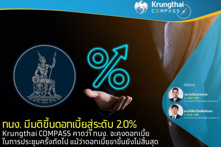 Krungthai COMPASS ประเมินว่า กนง. มีโอกาสคงดอกเบี้ยในการประชุมครั้งถัดไป เพื่อรอดูความชัดเจนของการจัดตั้งรัฐบาลและนโยบายทางเศรษฐกิจของภาครัฐ และอาจมีการปรับขึ้นอัตราดอกเบี้ยอีก 1 ครั้ง สู่ระดับ 2.25% ในช่วงปลายปี จากความกังวลต่ออัตราเงินเฟ้อพื้นฐานที่ยังทรงตัวอยู่ในระดับสูงและมีความเสี่ยงด้านสูง อีกทั้ง การฟื้นตัวของเศรษฐกิจไทยอาจเป็นปัจจัยหนุนต่อการปรับขึ้นอัตราดอกเบี้ยของ กนง.