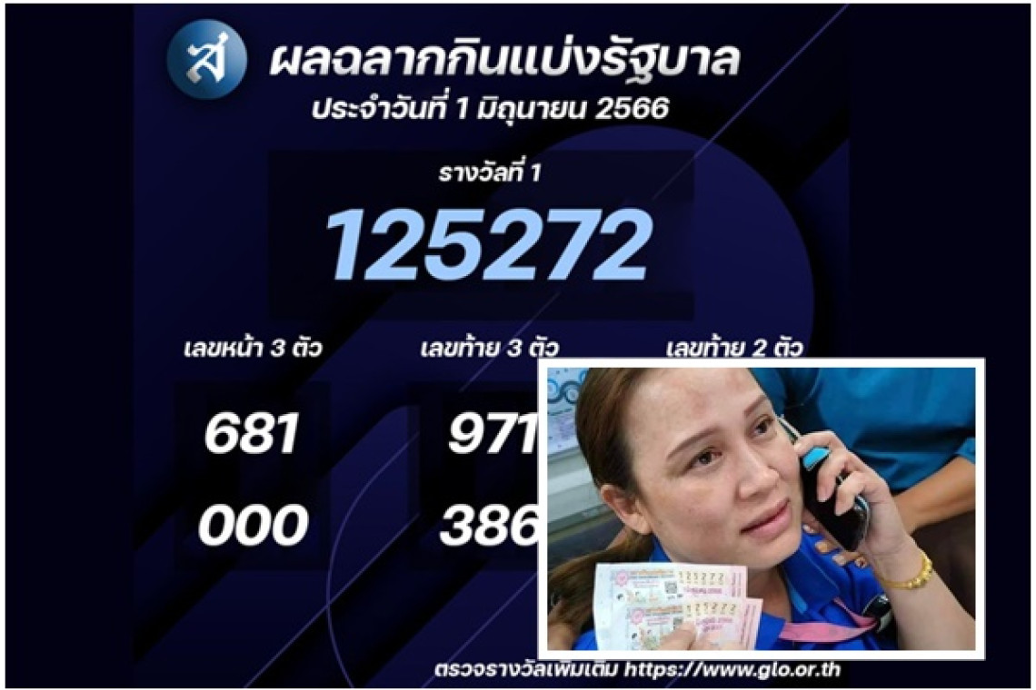 เมื่อวันที่ 1 มิ.ย.66 ผู้สื่อข่าวรายงานว่า หลังสำนักงานสลากกินแบ่งรัฐบาล ประกาศผลการออกรางวัล งวดประจำวันที่ 1 มิถุนายน 2566 โดยรางวัลที่ 1 ได้แก่หมายเลข 125272 รางวัลเลขหน้า 3 ตัว 681 000 ส่วนเลขท้าย 3 ตัวได้แก่ 971 และ 386 ขณะที่เลขท้าย 2 ตัว 09