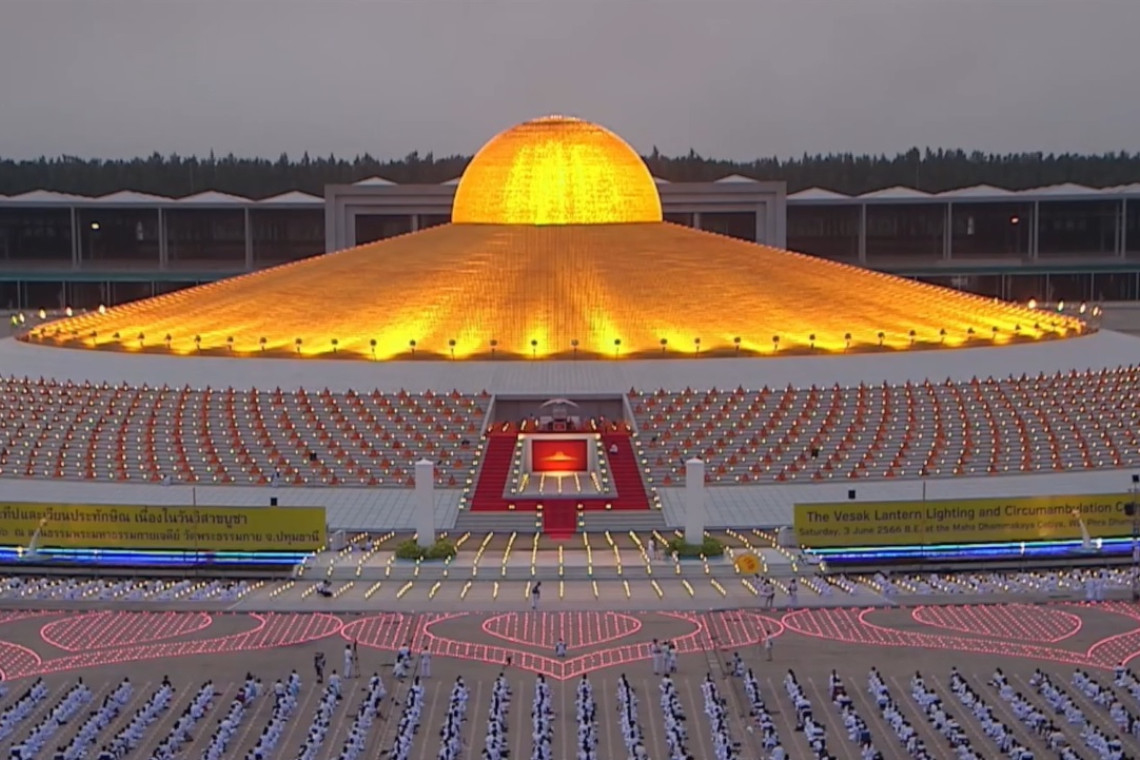 วันที่ 3 มิถุนายน 2566 เวลา 20.00 น.ผู้สื่อข่าวรายงาน ว่า ที่พระมหาเจดีย์พระพุทธเจ้าล้านพระองค์ วัดพระธรรมกาย ต.คลองสาม อ.คลองหลวง จ.ปทุมธานี พระวัดพระธรรมกายและศิษยานุศิษย์ร่วมกันจุดวิสาขประทีป และจุดประทีปแปรอักษรเป็นภาพ “ประสูติ ตรัสรู้ และปรินิพพาน” และร่วมเวียนประทักษิณรอบพระมหาธรรมกายเจดีย์ ต่อด้วยพิธีสวดธรรมจักรฉลองชัย ครบ 5,399,999,999 จบ เพื่อถวายเป็นพุทธบูชา บูชาพระรัตนตรัย และมหาปูชนียาจารย์ เนื่องในวันวิสาขบูชา วันสำคัญสากลของโลก