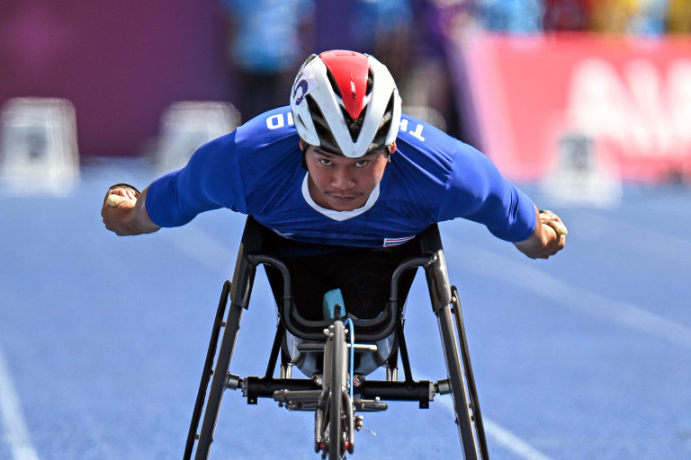 โดยช่วงเช้าไฮไลต์อยู่ที่รายการ วีลแชร์ 100 ม.ชาย คลาส T53 ที่มี 3 นักซิ่งวีลแชร์ทีมชาติไทย นำโดย "กร" พงศกร แปยอ นักซิ่งวีลแชร์ดีกรีเหรียญทองพาราลิมปิกเกมส์ 2 สมัย และ จิรวัฒน์ ศักดิ์ศิริพงษา และ โสภา อินทเสน ลงล่าแชมป์ ซึ่งการแข่งขันผลปรากฎว่า พงศกร แปยอ ยังคงโชว์ฟอร์มได้สมราคานักซิ่งวีลแชร์ระดับโลก ควบวีลแชร์คู่ใจนำแบบม้วนเดียวจบเข้าเส้นชัยได้เป็นคนแรก ด้วยสถิติ 12.98 วินาที คว้าเหรียญทองแรกในอาเซียนพาราเกมส์ครั้งนี้ไปครองได้สำเร็จ ส่วนเหรียญเงินเป็นของ เฮีย ฮอก จากกัมพูชา สถิติ 13.50 วินาที และเหรียญทองแดง ชฮุน ปุน จากกัมพูชา สถิติ 13.66 วินาที ขณะที่ โสภา อินทเสน เข้ามาเป็นอันดับ 4 สถิติ 11.95 วินาที และ จิรวัฒน์ ศักดิ์ศิริพงษา เข้าที่ 6 สถิติ 13.12 วินาที