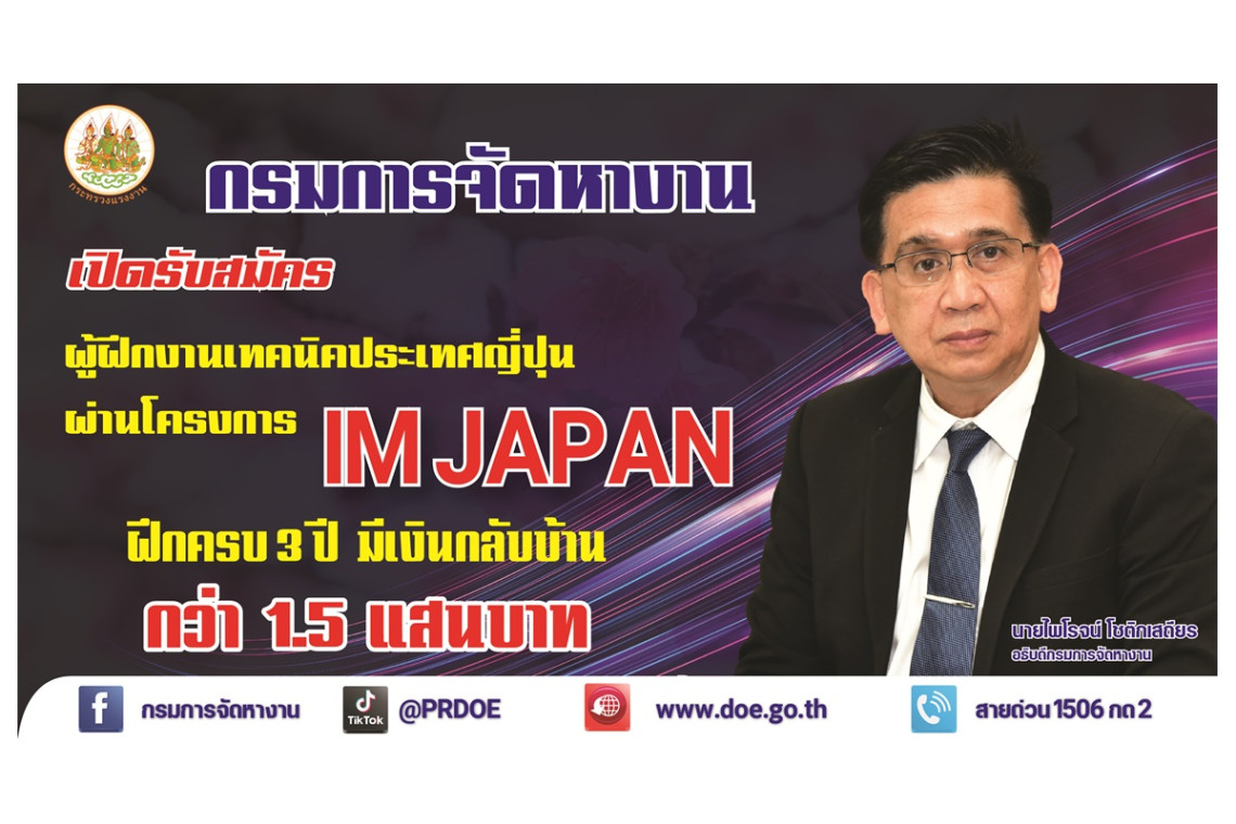 นายไพโรจน์ โชติกเสถียร อธิบดีกรมการจัดหางาน เปิดเผยว่า กรมการจัดหางาน ประกาศรับสมัครคัดเลือกผู้ฝึกงานเทคนิคคนไทยไปฝึกงานในประเทศญี่ปุ่นผ่านองค์กร IM Japan ปี 2566 ครั้งที่ 4 (เพศชาย) ในตำแหน่งผู้ฝึกปฏิบัติงานทางเทคนิค ประเภทงานอุตสาหกรรมการผลิตและก่อสร้าง ระหว่างวันที่ 25 พฤษภาคม - 18 มิถุนายน 2566 และสอบคัดเลือก ณ ศูนย์สอบกรุงเทพมหานคร โดยผู้ที่ผ่านการคัดเลือกเป็นผู้ฝึกปฏิบัติงานเทคนิคฯ เดือนแรกจะได้รับเบี้ยเลี้ยง 80,000 เยน หรือประมาณ 19,893 บาท ค่าที่พัก ค่าน้ำ-ค่าไฟ ฟรี และเดือนที่ 2 ถึงเดือนที่ 36 จะได้ค่าจ้างไม่น้อยกว่าอัตราค่าจ้างขั้นต่ำที่กฎหมายญี่ปุ่น ทั้งนี้เมื่อฝึกครบตามกำหนด จะได้รับประกาศนียบัตรรับรองการฝึกงาน และเงินสนับสนุนการประกอบอาชีพจำนวน 600,000 เยน หรือประมาณ 149,170 บาท (อัตราแลกเปลี่ยน ณ วันที่ 5 มิถุนายน 2566) เพื่อเป็นค่าใช้จ่ายในการประกอบอาชีพเมื่อเดินทางกลับประเทศไทย
