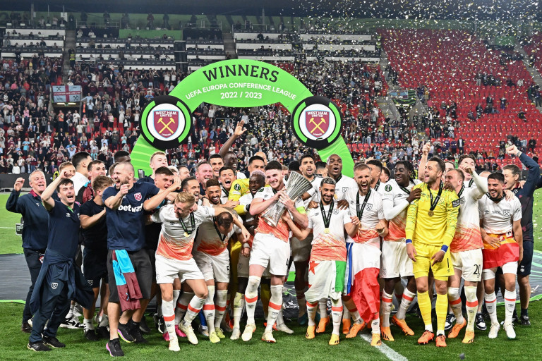 ภาพบรรยากาศ "เวสต์แฮม ยูไนเต็ด" ทีมในศึกพรีเมียร์ลีก ประเทศ อังกฤษ ฉลองแชมป์ยูโรป้า คอนเฟอเรนซ์ ลีก ฤดูกาล 2022-2023 ภายหลังเฉือนชนะ "ฟิออเรนติน่า" ยอดทีมในลีกกัลโช่เซเรียอา ประเทศอิตาลี ไปด้วยสกอร์ 2-1 ที่สนาม เอเดน อารีน่า สาธารณรัฐเช็ก เป็นแชมป์แรกของพวกเขาในรอบ 43 ปี หรือถ้านับแค่ฟุตบอลยุโรปนี่คือแชมป์แรกในรอบ 58 ปี
