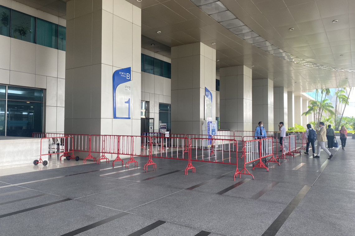 วันที่ 8 มิ.ย.66 เมื่อเวลา 10.00 น. ผู้สื่อข่าวรายงานบรรยากาศที่สำนักงานคณะกรรมการการเลือกตั้ง (กกต.) อาคารรัฐประศาสนภักดี (อาคารบี) ศูนย์ราชการฯ ถ.แจ้งวัฒนะ เจ้าหน้าที่นำแผงเหล็กสีแดงมาตั้งเป็นแนวก่อนทางเข้าอาคาร โดยประชาชนที่จะเข้ามาติดต่อราชการภายในอาคารจะต้องผ่านจุดตรวจแสดงบัตรประชาชน สแกนใบหน้า และตรวจสัมภาระก่อนเข้าอาคารด้วย