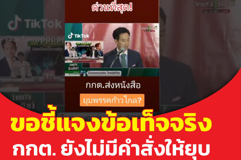 วันที่ 8 มิ.ย. 66 สำนักงานคณะกรรมการการเลือกตั้ง (กกต.) ออกประกาศชี้แจง สืบเนื่องจากกรณีที่มีผู้ใช้ TikTok ชื่อบัญชีว่า “arfanpppppp” โพสต์คลิปพร้อมข้อความลงTikTok ว่า “ด่วนที่สุด กกต. ส่งหนังสือยุบพรรคก้าวไกล?” นั้นกกต.ขอชี้แจงว่า หนังสือฉบับดังกล่าว เป็นหนังสือที่ออกโดยคณะกรรมการรวบรวมข้อเท็จจริง และพยานหลักฐานของนายทะเบียนพรรคการเมือง คณะที่ 3 และเมื่อได้ตรวจพบข้อผิดพลาดที่ได้กล่าวอ้างพาดพิงไปถึงพรรคเพื่อไทย (พท.) คณะกรรมการฯ จึงได้แก้ไขข้อความให้ถูกต้อง และส่งหนังสือฉบับแก้ไขไปให้หัวหน้าพรรคก้าวไกลเสร็จสิ้นเป็นที่เรียบร้อยแล้ว