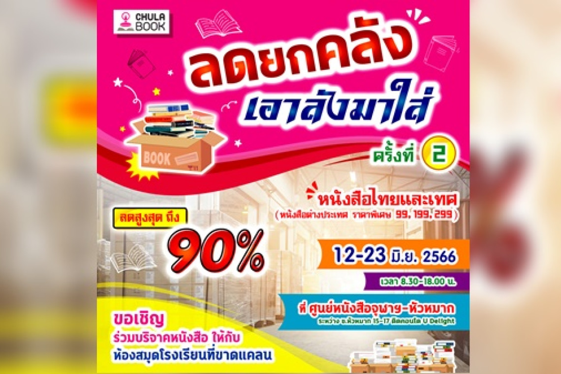 ศูนย์หนังสือจุฬาลงกรณ์มหาวิทยาลัย สาขาหัวหมาก ขอเชิญส่งมอบโอกาสทางการอ่านให้กับห้องสมุดโรงเรียนที่ขาดแคลนหนังสือ ในงาน... “ลดยกคลัง เอาลังมาใส่” ครั้งที่ 2 ระหว่างวันที่ 12 – 23 มิถุนายน 2566 เวลา 08.30 – 18.00 น. ณ ศูนย์หนังสือจุฬาฯ สาขาหัวหมาก (อยู่ระหว่างซอย หัวหมาก 15-17) พบกับหนังสือจากหลากหลายสำนักพิมพ์ทั้งภาษาไทย และต่างประเทศ ในราคาลดพิเศษ ภายใต้คอนเซ็ปต์ “ซื้ออ่านเพิ่มปัญญา ซื้อบริจาคสร้างความสุข”