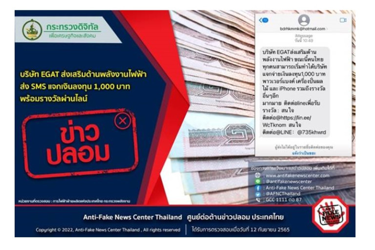 นายประเสริฐศักดิ์ เชิงชวโน รองผู้ว่าการยุทธศาสตร์ การไฟฟ้าฝ่ายผลิตแห่งประเทศไทย (กฟผ.) ในฐานะโฆษก กฟผ. เตือนภัยประชาชน เนื่องจากมีกลุ่มมิจฉาชีพหลอกลวงปลอมตัวตนเป็นพนักงาน กฟผ. เพื่อสร้างความน่าเชื่อถือ หลอกชวนลงทุนบนเว็บไซต์ กฟผ. ปลอม ซึ่งเลียนแบบลิงก์และหน้าเว็บไซต์ให้มีลักษณะคล้ายคลึงกับเว็บไซต์ของ กฟผ. และนำไปเชิญชวนผู้ที่สนใจเข้าร่วมลงทุนในกองทุนพลังงานหมุนเวียน ทำให้มีผู้หลงเชื่อกรอกข้อมูลหรือสมัครสมาชิก ซึ่งอาจถูกขโมยข้อมูลส่วนตัว เช่น หมายเลขบัตรประชาชน ชื่อ นามสกุล เบอร์โทรศัพท์ รวมถึงยังมีการหลอกลวงในรูปแบบชวนลงทุนสวัสดิการของพนักงาน เพื่อจะได้รับดอกเบี้ยในอัตราสูงอีกด้วย