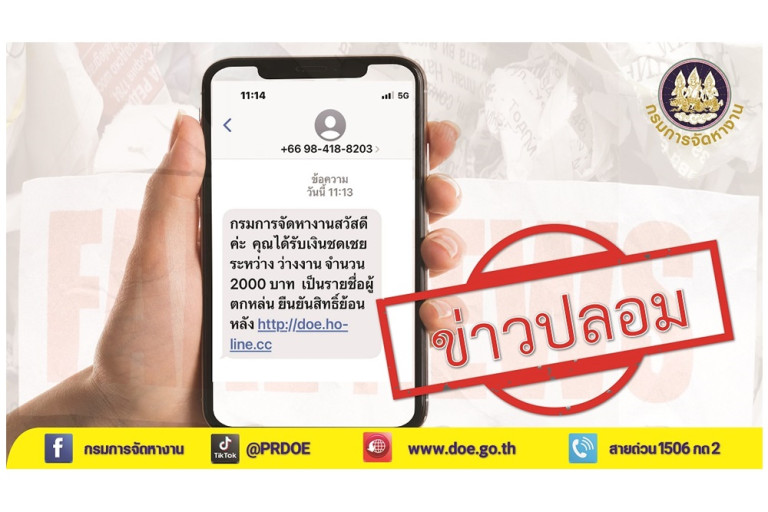อธิบดีกรมการจัดหางานเตือนประชาชนอย่าหลงเชื่อ SMS อ้างชื่อกรมการจัดหางาน แจ้งได้รับเงินชดเชยระหว่างว่างงาน ชี้ไม่เป็นความจริงอย่ากดเข้าลิงก์