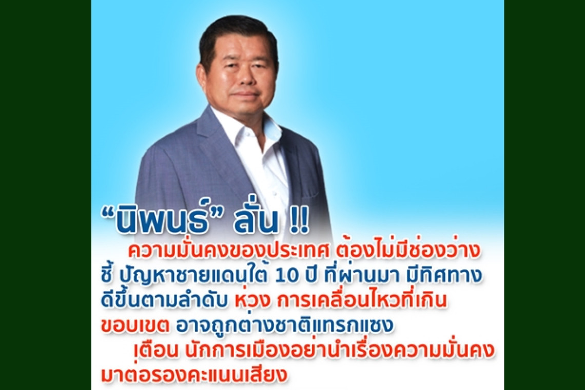 "นิพนธ์" ลั่นความมั่นคงของประเทศต้องไม่มีช่องว่าง ชี้ปัญหาชายแดนใต้ 10 ปีที่ผ่านมา มีทิศทางดีขึ้นตามลำดับ ห่วง การเคลื่อนไหวที่เกินขอบเขต อาจถูกต่างชาติแทรกแซง เตือน นักการเมืองอย่านำเรื่องความมั่นคงมาต่อรองคะแนนเสียง