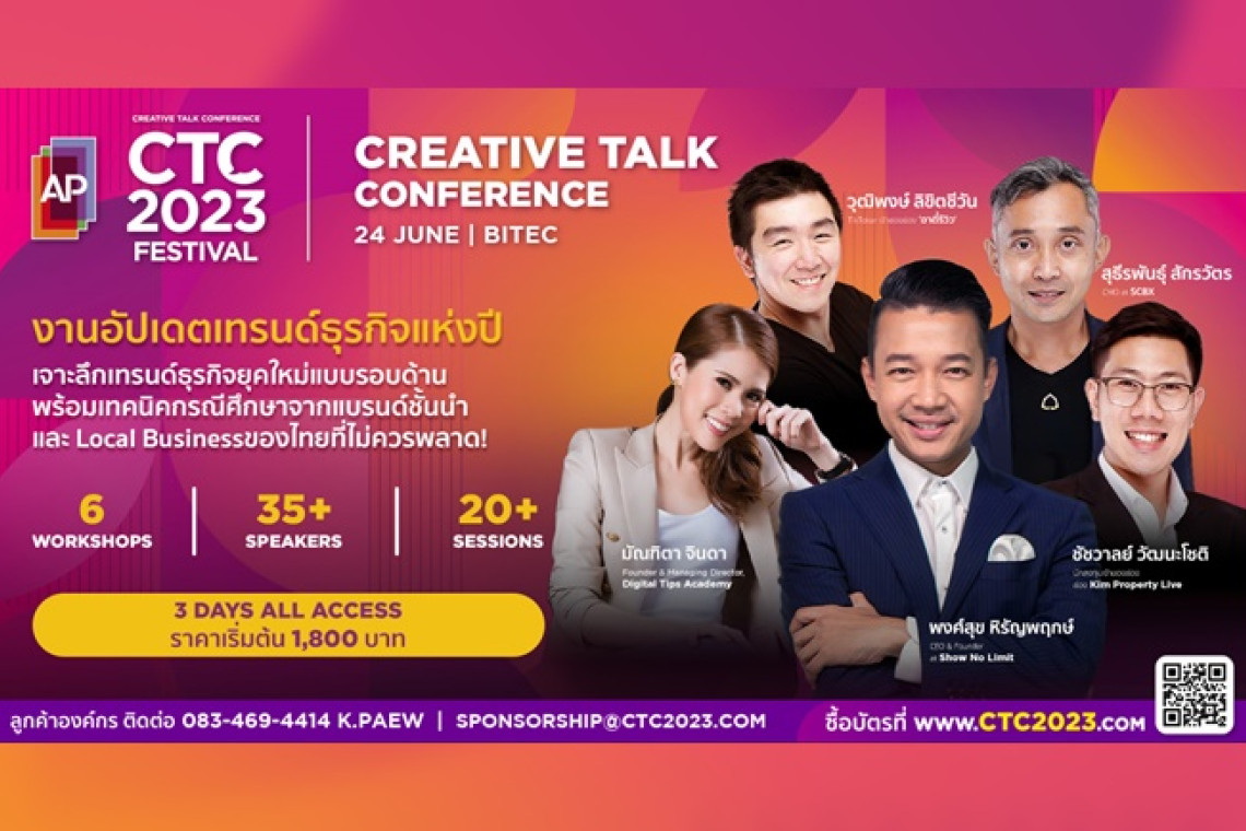 งานนี้เป็นส่วนหนึ่งของ CREATIVE TALK CONFERENCE 2023 FESTIVAL เทศกาลอัปเดตเทรนด์ความรู้แห่งปี ที่รวมสปีคเกอร์ชั้นนำมากกว่า 100 คน เสวนากว่า 60 หัวข้อ จากแวดวง Creative, Marketing, Innovation, Entrepreneurship และ People โดย CTC2023 FESTIVAL จะจัดตั้งแต่วันที่ 22 - 24 มิถุนายน 2566 ที่ไบเทคบางนา